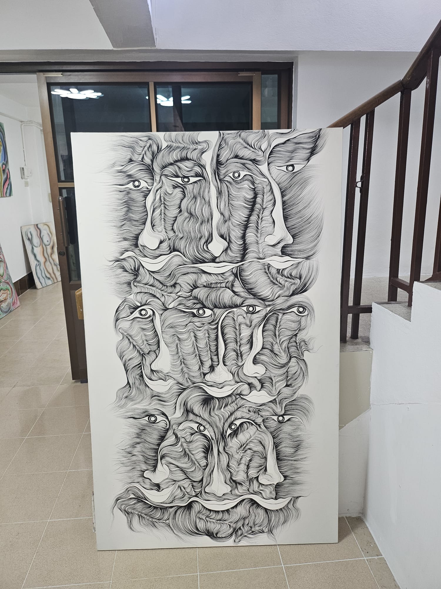 This monumental black-and-white composition unfolds like a labyrinth of faces and consciousness layered upon one another. Fluid, hair-like lines ripple across the surface, merging and separating in a continuous flow that feels both organic and infinite. Within this intricate texture, multiple visages emerge — profiles, front-facing eyes, and half-hidden expressions — all interwoven into a single, unified form.
